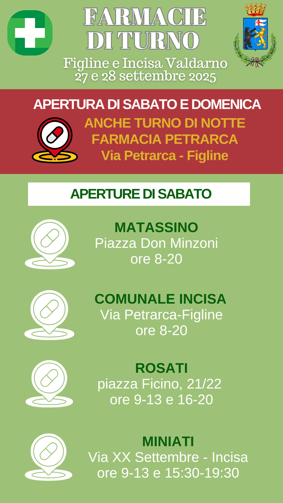 Ecco di seguito le farmacie di turno aperte il prossimo fine settimana a Figline e Incisa Valdarno.