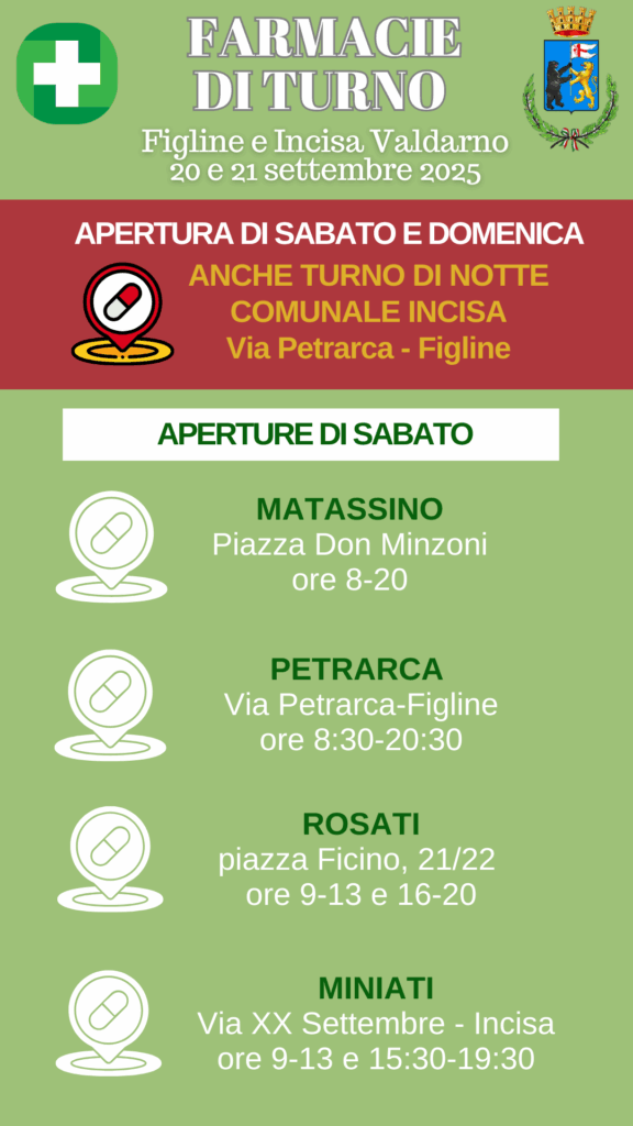 Ecco di seguito le farmacie di turno aperte il fine settimana del 20 e 21 settembre a Figline e Incisa Valdarno.