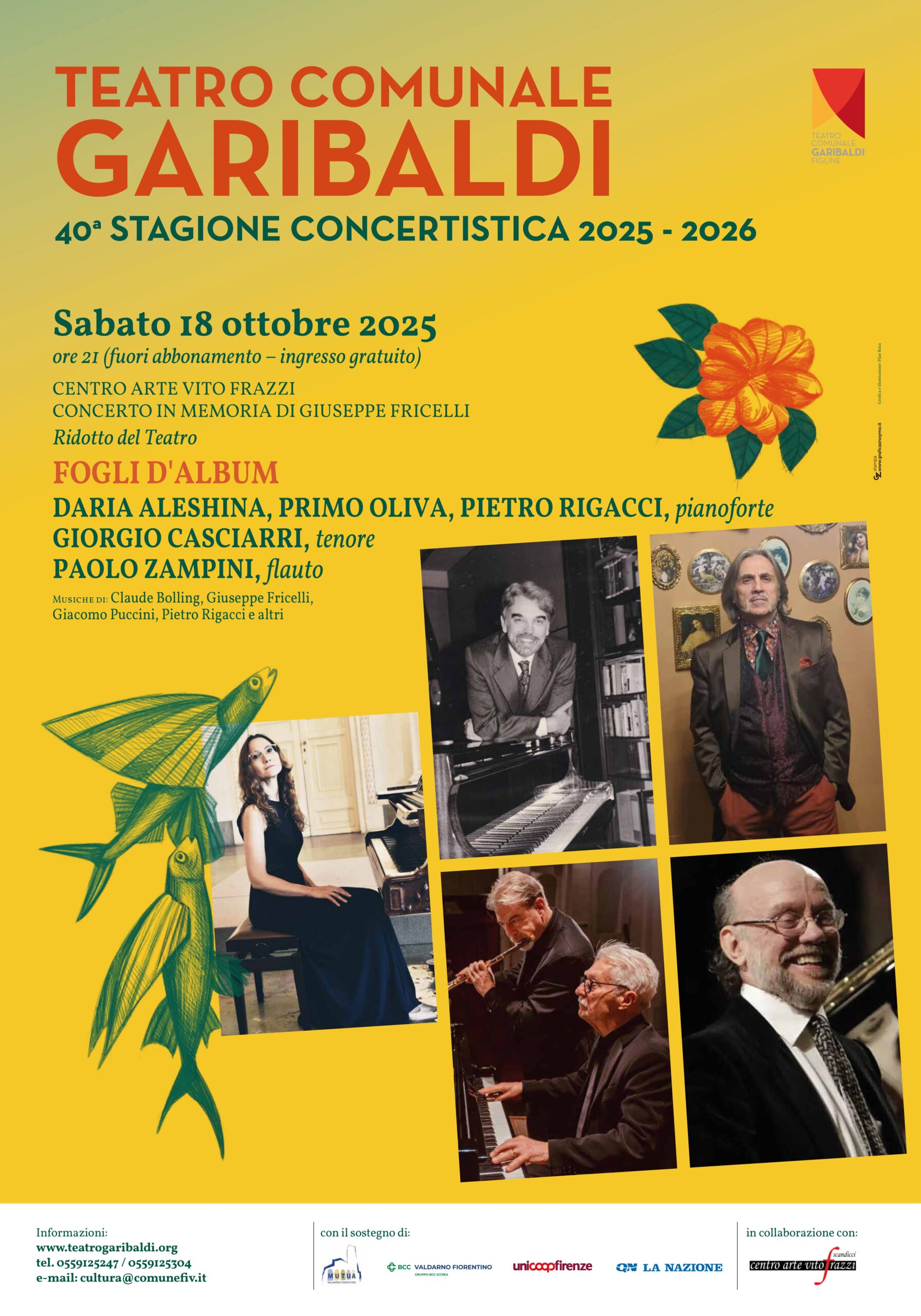 Sabato 18 ottobre alle ore 21, al Ridotto del Teatro Comunale Garibaldi si terrà un concerto della stagione concertistica 2025/2026 dal titolo "Fogli d'album", un concerto in memoria di Giuseppe Fricelli.