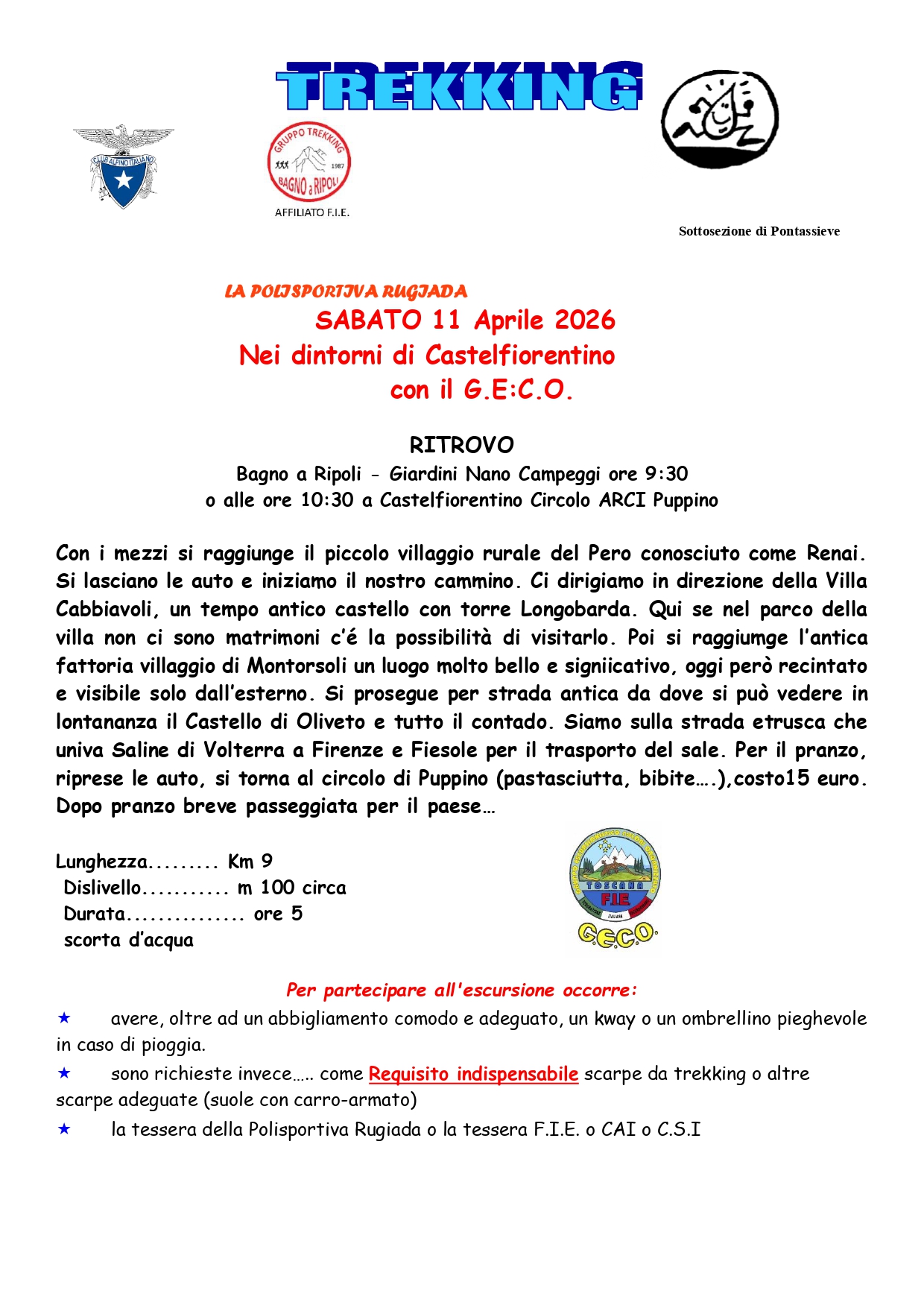 Sabato 11 aprile la Polisportiva Rugiada organizza l'escursione trekking "Nei dintorni di Castelfiorentino" in collaborazione con G.E.C.O.