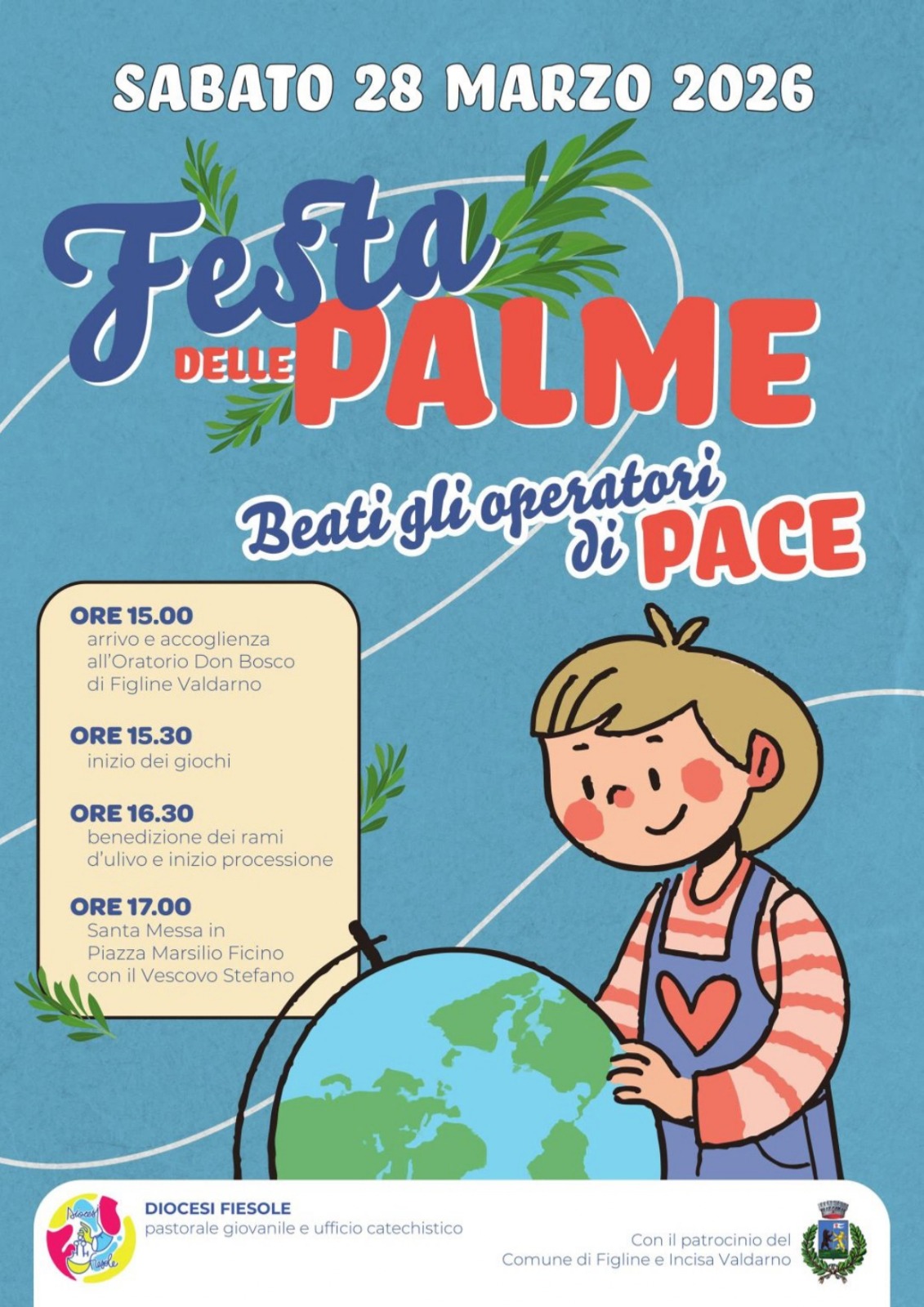 La Festa delle Palme inizierà alle ore 15:00 con il ritrovo e l'accoglienza presso l'Oratorio Don Bosco, per proseguire con giochi e animazione.