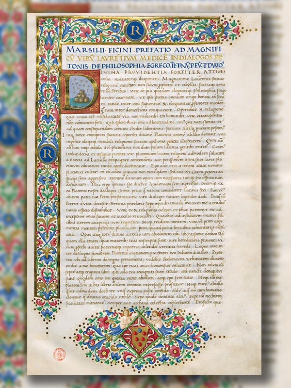 | Stavolta non vi proponiamo un libro preso dai nostri scaffali, ma un invito a entrare, almeno virtualmente, in un’altra biblioteca e sfogliare quella che è a tutti gli effetti un’opera d’arte: il primo dei due volumi dei Dialoghi di Platone tradotti da Marsilio Ficino per Lorenzo de’ Medici, conservato alla Biblioteca Medicea Laurenziana e oggi interamente disponibile in versione digitale. Il manoscritto fu completato nel 1484, dopo una lavorazione durata vent’anni, da quando Cosimo il Vecchio aveva invitato il figlinese a restituire con una traduzione il pensiero platonico alla cultura europea. Un’impresa destinata a cambiare la storia del pensiero occidentale. Ventisette dialoghi, dal Simposio al Fedro, corredati da testi introduttivi a fare da guida per il lettore, proprio come nelle edizioni più curate. Certo, leggere in latino non è cosa da tutti, ma basta uno sguardo per lasciarsi conquistare: il tratto spigoloso della lettera bastarda (così chiamata perché univa la scrittura cancelleresca a quella mercantesca), il ricco fregio floreale che incornicia la pagina, i capolettera dorati, lo stemma dei Medici con la palla azzurra gigliata miniato in basso. In chiusura della sua dedica, Ficino scriveva al Magnifico: «Con questo libro tu porterai agli dèi un favore perenne alla città di Firenze, e lo raccomanderai a tutta la posterità». Ed eccoci qua, secoli dopo, a sfogliarlo ancora. |  |  |