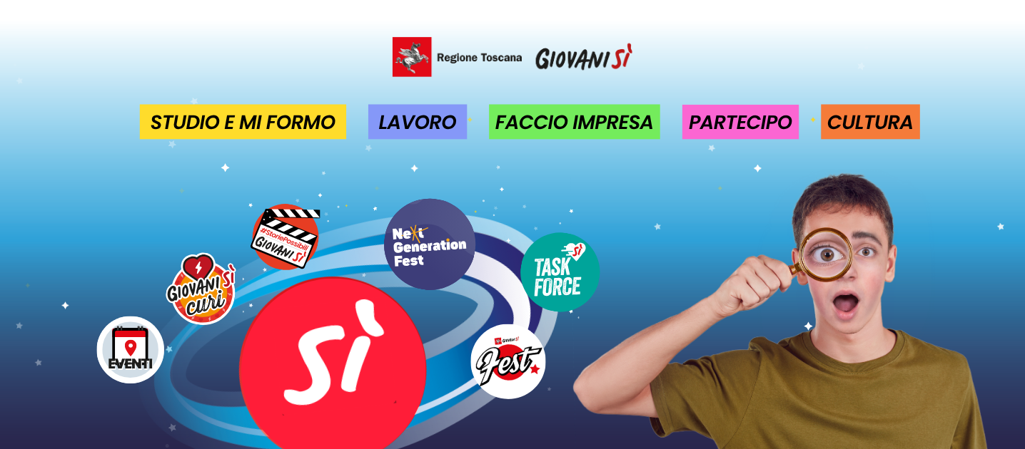 Sono tante le opportunità offerte dal programma Giovanisì, il progetto della Regione Toscana per l’autonomia dei giovani fino a 40 anni, finanziate attraverso risorse regionali, nazionali ed europee (programmazione dei fondi FSE+, FESR e FEASR) e distinte in 5 aree: Studio e mi formo, Lavoro, Faccio impresa, Partecipo e Cultura.