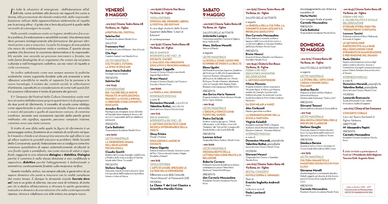 Nei giorni 8-9-10 Maggio 2026, il Cinema Teatro Roma AB, l'Oratorio Don Bosco e la Chiesa di San Francesco ospitano il Festival della Cultura Umanistica 7° Simposio "Socrate dove sei? Dalla scuola come obbligo all'educazione come cammino condiviso".